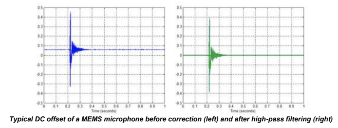 - DC offset: 많은 마이크, 특히 MEMS와 콘덴서 유형은, 출력 시 정상 상태 DC 전압을 발생시키며, 이는 다운스트림 구성 요소에 손상을 줄 수 있기 때문에 제거해야 한다.