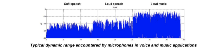 음원과 관련된 마이크의 위치는 스피커폰이나 디지털 카메라와 같은 어플리케이션에서는 예측할 수 없으며, 소스는 1cm 또는 100m까지 떨어져 있을 수 있다. 환경은 때때로 예측할 수 없다; 그것은 40dB SPL의 조용한 방일 수도 있고 100dB SPL의 붐비는 클럽일 수도 있다. 종종, 같은 브랜드와 모델이 수많은 어플리케이션에 걸쳐 지정될 수도 있다. 따라서 이러한 모든 조건과 그 이상을 수용해야 한다.