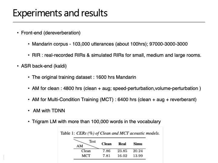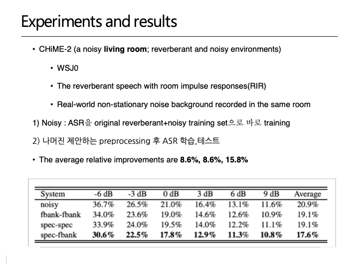 - ASR 을 위한 데이터 따로 존재. 클린으로만 ASR AM training, Multi-condition Training (MCT)- noisy로도 ASR AM training 따로 실험.