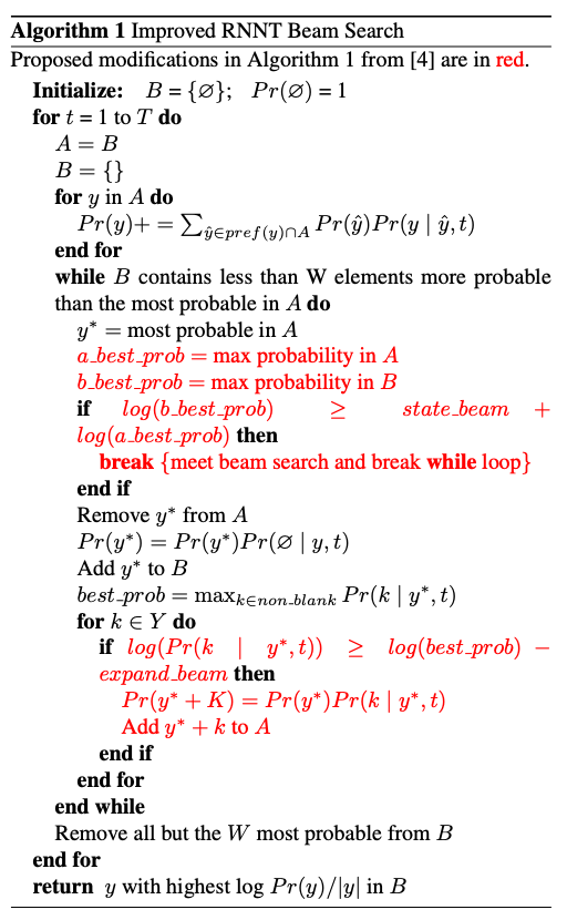 2) 또한 A에 추가되는 hypothesises의 개수를 제한하는 expand_beam을 도입했다. hypothesis set B가, hypothesis set A에서 가장 가능성있는 hypothesis 보다 probability가 높은 W(beam width) 개의 hypothesis를 갖자마자 beam search criterion은 시간 t에서 충족되며, 프레임 t + 1 처리를 시작할 수 있다.y_t, h를 생성하는 (t, h)에서의 Joiner 호출의 경우, 먼저 Hypothesis set A 와 B 에서의 최고의 확률 값 (non-blank output unit (yt, h) 중에서 최고의 확률과, 최고의 확률)을 계산한다. 그 후, log (best prob)보다 log (Pr (k | y ∗, t)가 더 높은 output, k만 추출하여 hypothesis set A에 추가한다.