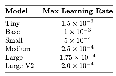 - Different max learning rates were used for different model sizes.