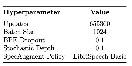 - For Whisper Large V2, additional techniques like SpecAugment, Stochastic Depth, and BPE Dropout were introduced for regularization.