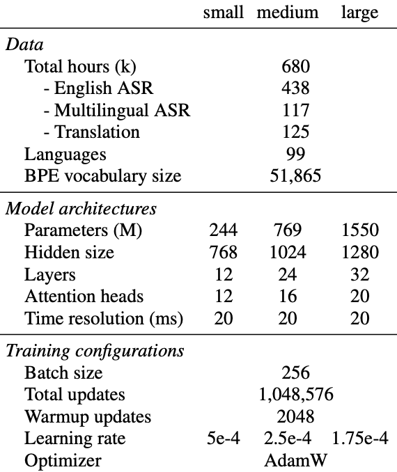 - Trained on 1 million hours of weakly labeled audio and 4 million hours of pseudolabeled audio of pseudolabeled audio collected using Whisper large-v2. The model was trained for 2.0 epochs over this mixture dataset.