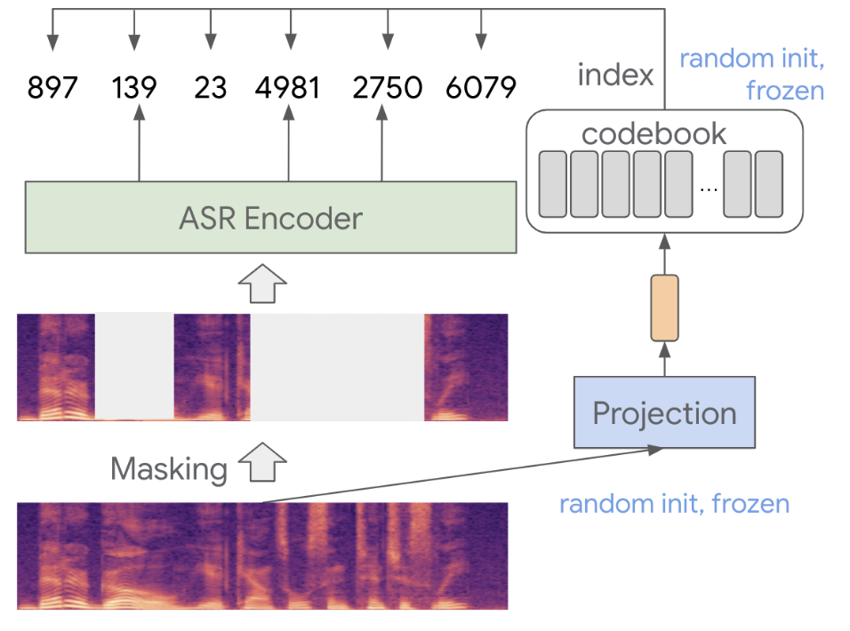 BEST-RQ applies Masked Language Modeling (MLM), much like BERT does for text, but in this case for speech. During training, certain portions of the speech signal are masked and replaced with noise.