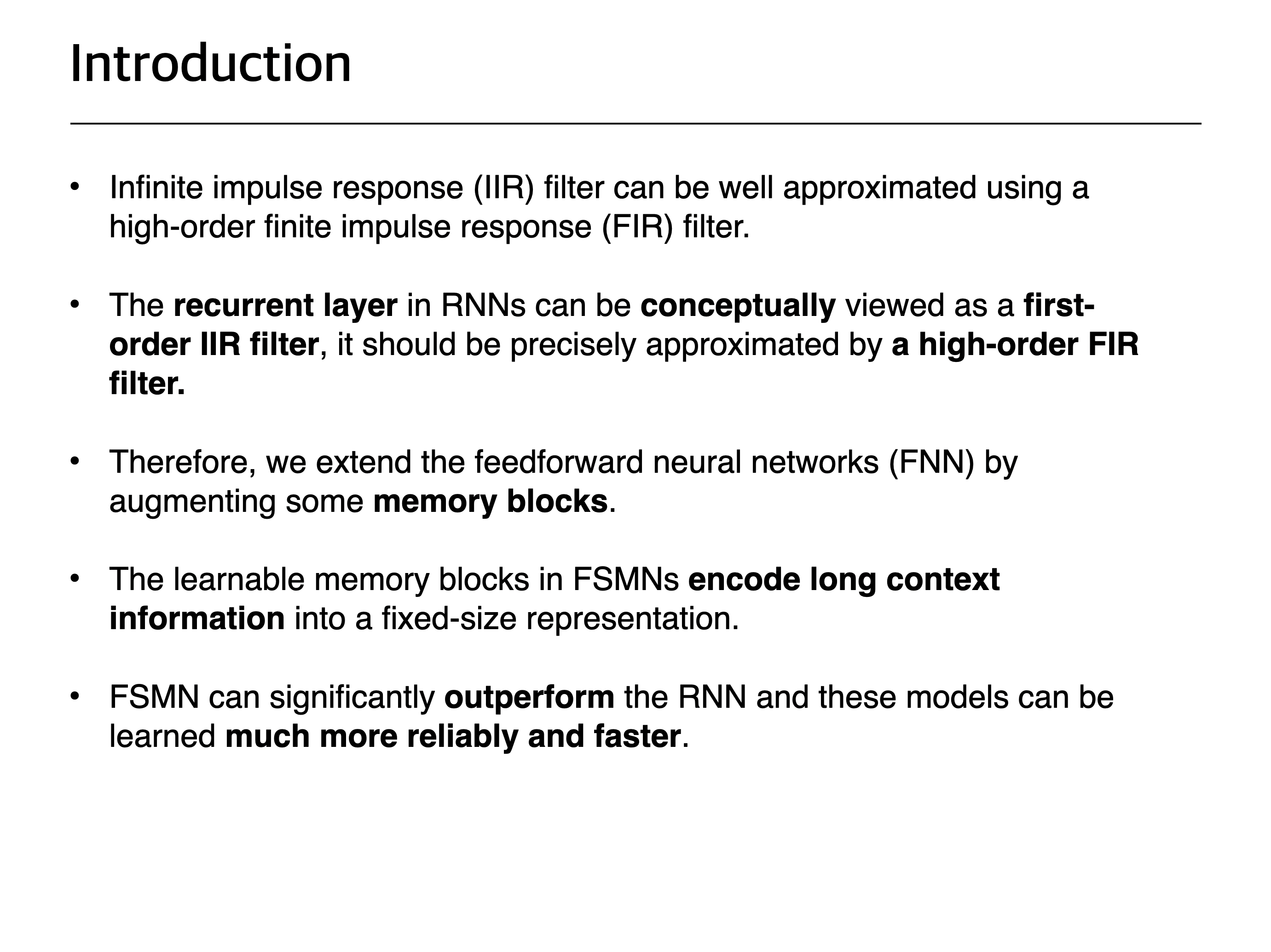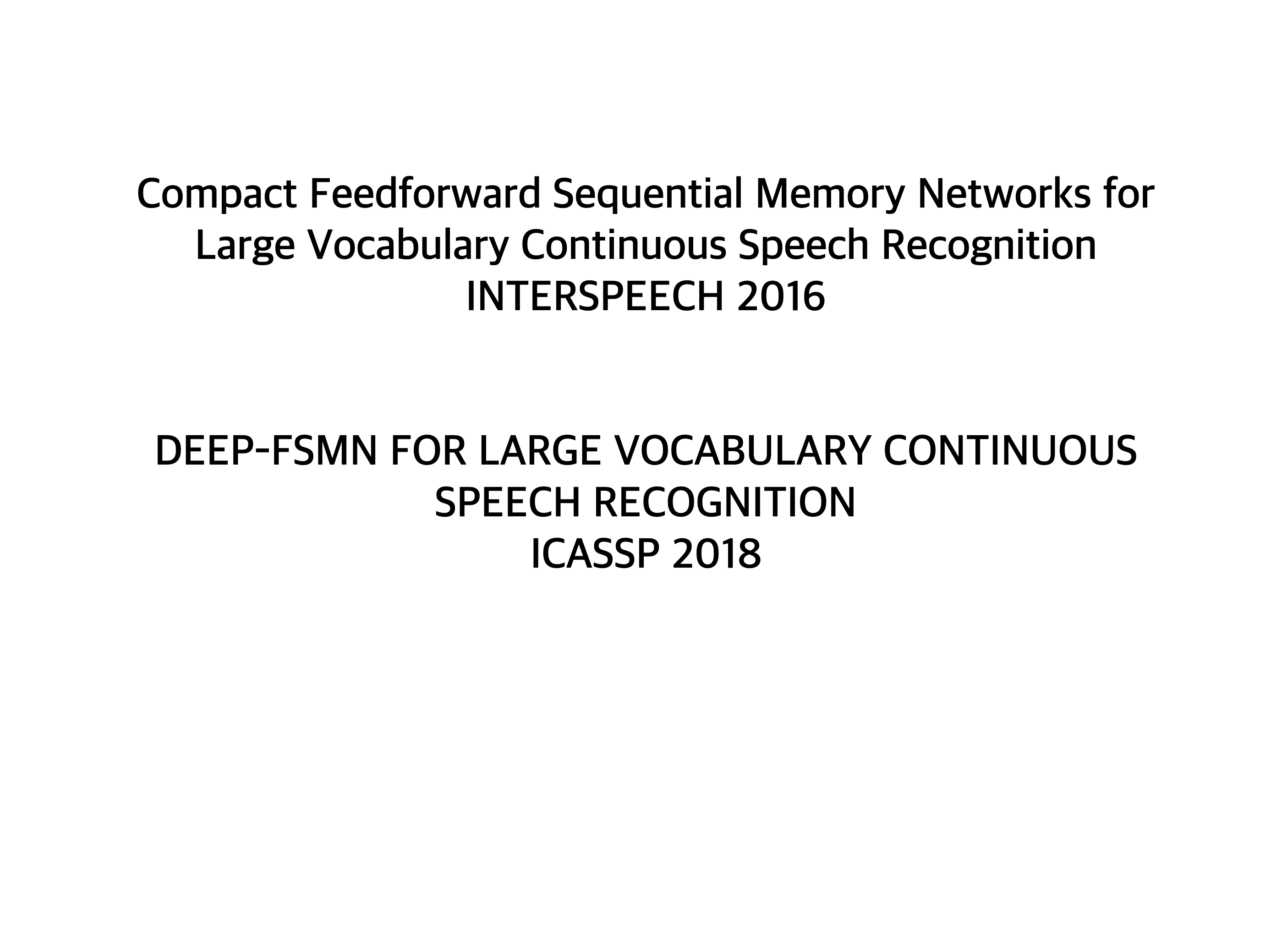 - 음성인식기 음향 모델 중 뛰어난 성능을 내고 있는 FSMN 에 대한 논문들을 리뷰해 보았다.
