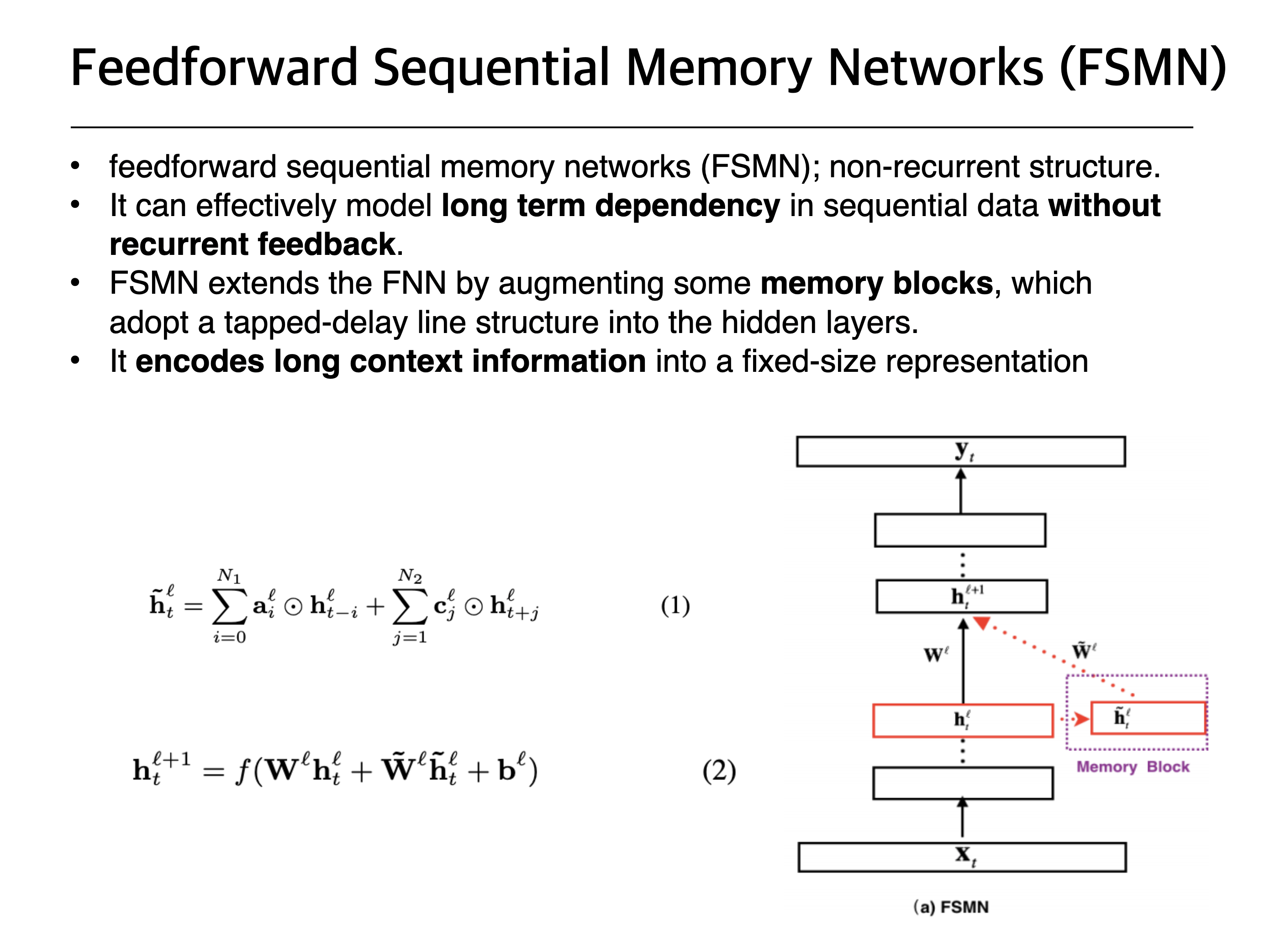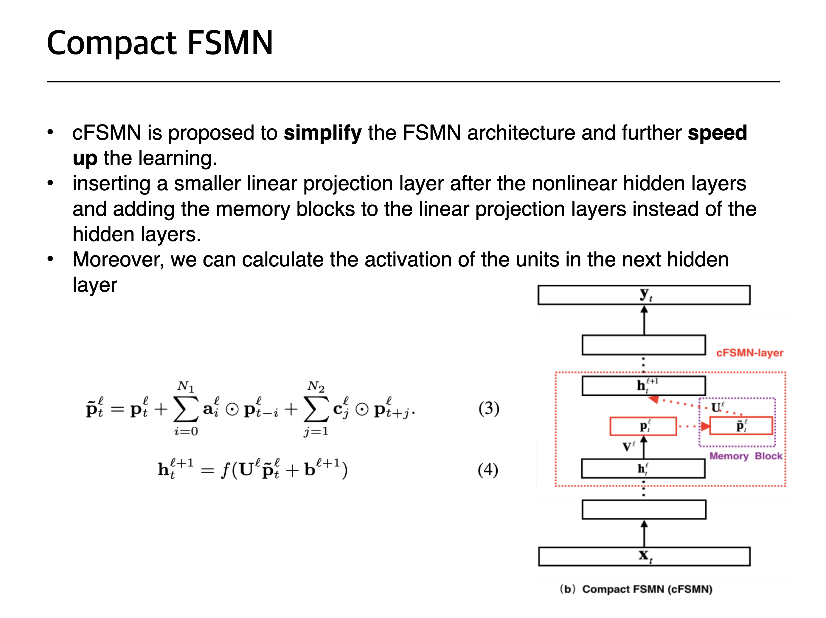 - scalar FSMN, vector FSMN, compact (vector) FSMN, Deep-FSMN