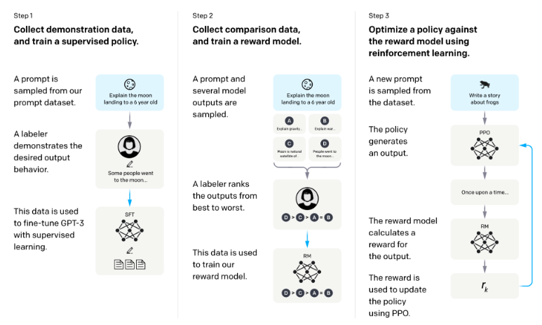 The labeling process would produce data that looks like this: (prompt, winning_response, losing_response). This is called comparison data.