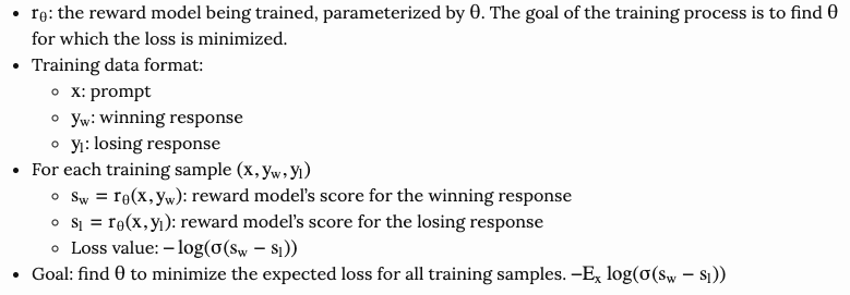 - Training data: high-quality data in the format of (prompt, winning_response, losing_response)