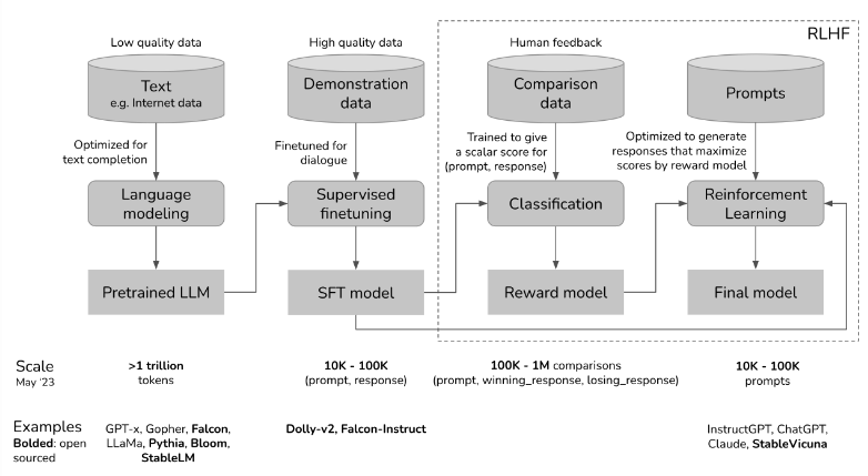 The result of the pretraining phase is a large language model (LLM), often known as the pretrained model. Examples include GPT-x (OpenAI), Gopher (DeepMind), LLaMa (Meta), StableLM (Stability AI).