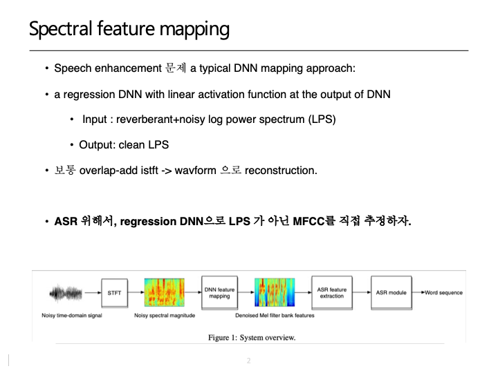 -일반적으로 사용되는 DNN, LSTM, CNN을 이용한 spectral feature mapping 논문들은 성능 측정 measure로 PESQ, SDR, STOI 등을 제시, but 최종 ASR을 위한 WER measure 측면에서 성능 향상을 원함-> DL 구조 output 을 일반적인 filterbank or MFCC 로 사용함.
